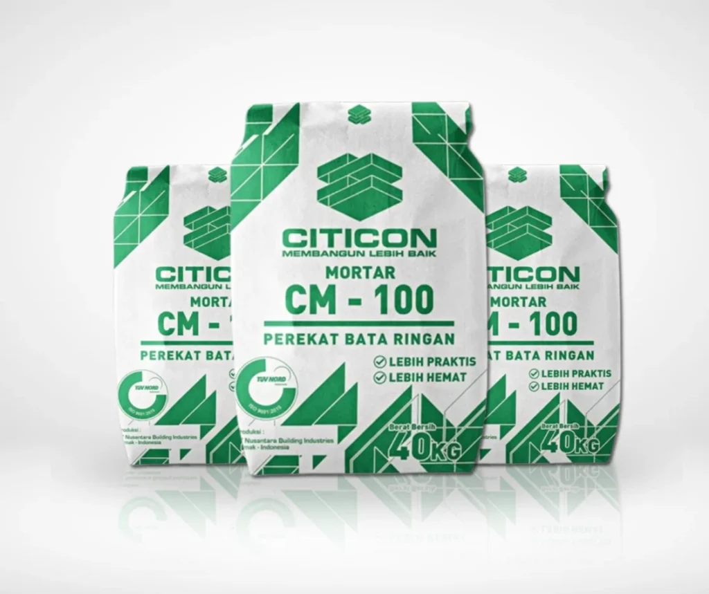 Semen Mortar Citicon diformulasikan sebagai perekat Bata Ringan Citicon. dengan mengantongi sertifikat standarisasi ISO 9001:2015 Citicon bertekat untuk menjaga kualitas. Semen Mortar Citicon hadir memenuhi kebutuhan dan memberikan kemudahan untuk konsumen Bata Ringan Citicon.